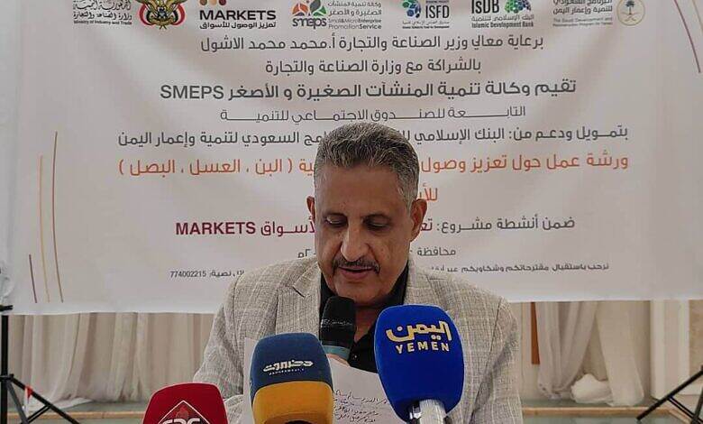 وشارك وكيل وزارة الزراعة في افتتاح ورشة نظمتها وكالة تنمية المنشآت الصغيرة و الأصفر التابعة للصندوق الاجتماعية للتنمية حول تعزيز وصول المنتجات اليمنية ( البن ـ العسل ـ البصل ) الى الأسواق الخارجية بدعم من البنك الإسلامي و البرنامج السعودي لتنمية واعمار اليمن .