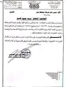 وحسب المذكرة الأمنية، فإن الصحفي الفقية متهم بواقعة التشهير والكتابة المسيئة ، ضد قيادة وزارة الشباب والرياضة .