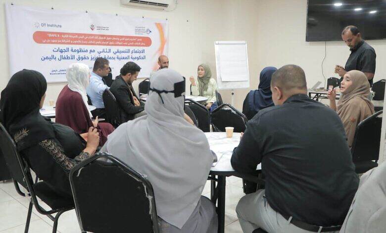 عقد التحالف اليمني لرصد انتهاكات حقوق الإنسان (تحالف رصد)، بالتعاون والشراكة مع معهد "دي تي"، الأربعاء 15 اكتوبر، اجتماعا تنسيقيا هو الثاني من نوعه مع عدد من الجهات الحكومية المعنية والتي تشكل المنظومة المعنية بحماية وتعزيز حقوق الأطفال في اليمن.