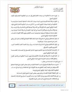 وتضمنت الاجراءات معالجة الاختلالات القائمة في عملية تحصيل وتوريد الموارد العامة في المحافظات من خلال التزام كافة المحافظات ( العاصمة عدن ، مأرب ، وحضرموت ، المهرة ، تعز ) بتوريد كافة الايرادات المركزية إلى الحسابات المخصصة لها " حساب الحكومة العام " طرف البنك المركزي وفروعه في المحافظات فيما يمنع تجنيب والصرف من هذه الموارد تحت أي مبرر .