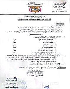 اللجنة تضمنت وكيل المحافظة للشئون التنموية ،ومدير عام الموارد المالية ،ومدير عام مكتب المالية، ومدير عام مكتب الضرائب، ومدير عام مكتب الشؤون القانونية، وممثل عن فرع الجهاز المركزي للرقابة والمحاسبة .
