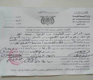 قدم مدير مؤسسة كهرباء تعز بلاغا ضد الموظفة نجوى أحمد سيف العبسي ،فيما أصدر البحث الجنائي في المحافظة تكليف بالحضور لها ،والزمت شعبة الجرائم فيما يسمى بقسم المعلومات ، العبسي بالحضور في الوقت المحدد.