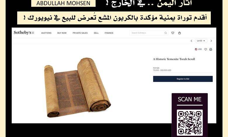 تُعرض في دار سوذبيز في نيويورك في 17 ديسمبر 2025م، واحدة من أندر لفائف التوراة اليمنية المعروفة حتى اليوم، المخطوطة تاريخية تعود أقدم رقوقها إلى الفترة ما بين 1425 و1450م، أواخر حكم الدولة الرسولي وهي توراة يمنية تعد الاقدم، وتحوي الكربون المشع وتُعرض للبيع في نيويورك وهُربت من صنعاء في مارس 2016م