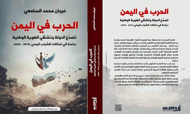 صدر حديثاً عن مؤسسة أروقة للدراسات والترجمة والنشر بالقاهرة كتاب جديد للباحث السوسيولوجي اليمني عيبان محمد السامعي بعنوان: "الحرب في اليمن: تصدع الدولة وتشظّي الهُوية الوطنية – دراسة في تمثلات الشباب اليمني (2015 -2025)". ويسلط الكتاب الضوءَ على واحدةٍ من أخطر تداعيات الحرب المستمرة في اليمن، وهي التحولات العميقة التي أصابت الهُوية الوطنية.