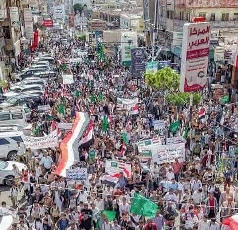 عشرات الآلاف يتظاهرون في تعز تضامنًا مع السعودية ودول الخليج مع استمرار الاعتداء الإيراني.