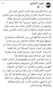 واختتم الشماري منشوره بتساؤل ساخر موجّه للمسؤولين حول كيفية مواجهة التاريخ، في ظل ما وصفه بتحوّل اليمني من إنسان “عزيز النفس” إلى ضحية تُدفع إلى حروب بعيدة نتيجة تردي الأوضاع في البلاد.
