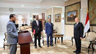 ادى عبد الرحمن شيخ محافظ عدن اليمين الدستورية امام فخامة الرئيس الدكتور رشاد محمد العليمي، رئيس مجلس القيادة الرئاسي، مع…